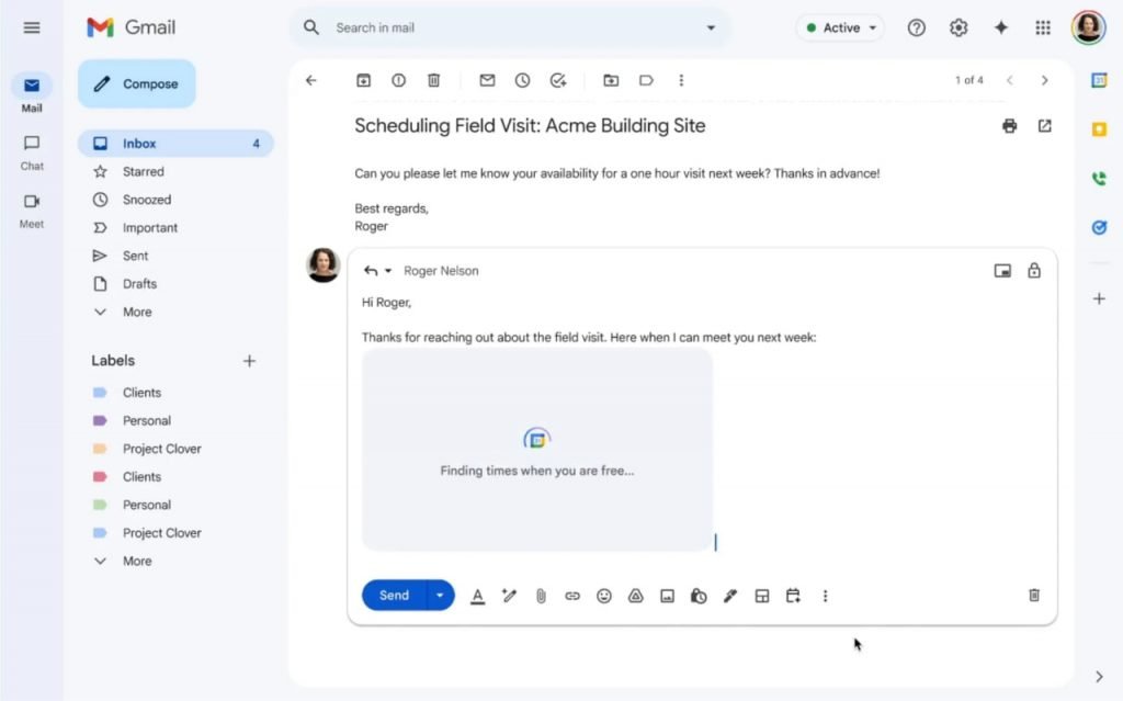 طبق گزارشهای منتشرشده، با این قابلیت زمانی که درحال نوشتن ایمیل جدیدی هستید که بهنظر میرسد درباره هماهنگی یک قرار یا جلسه کاری است، جیمیل بهطور خودکار این موضوع را تشخیص میدهد. سپس گزینهای در نوار پایین صفحه نمایش داده میشود تا با یک کلیک بتوانید از Gemini کمک بگیرید.