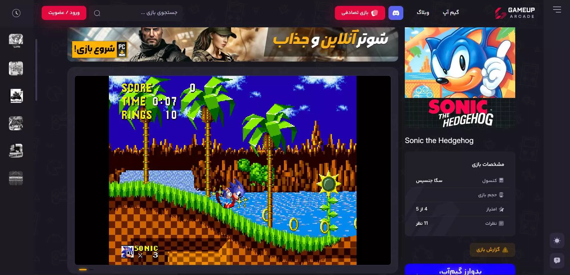 با مراجعه به وبسایت ایرانی Gameup Arcade، بدون نیاز به نصب میتوانید بازیهای خاطرهانگیز ازجمله Sonic و Super Mario Bros و صدها بازی نوستالژی دیگر را اجرا کنید. بعد از ورود به سایت از طریق گوشی یا لپتاپ، وارد یکی از عناوین موردعلاقهتان شوید. پس از لود شدن صفحه، دکمه «شروع بازی» را بزنید و منتظر دانلود و اجرای آن بمانید. تنظیمات مربوطبه بازی را هم میتوانید از منویی که زیر آن تعبیه شده تغییر دهید.