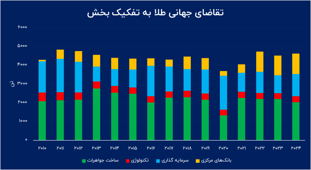 مطابق نمودار بالا، از سال 2022 تقاضا برای طلا از سمت بانکهای مرکزی و همچنین به منظور سرمایهگذاری توسط صندوقها و شرکتهای بزرگ افزایش چشمگیری یافته، در سوی مقابل تقاضای این فلز گرانبها برای ساخت جواهرات با کاهش محسوسی همراه بوده است.