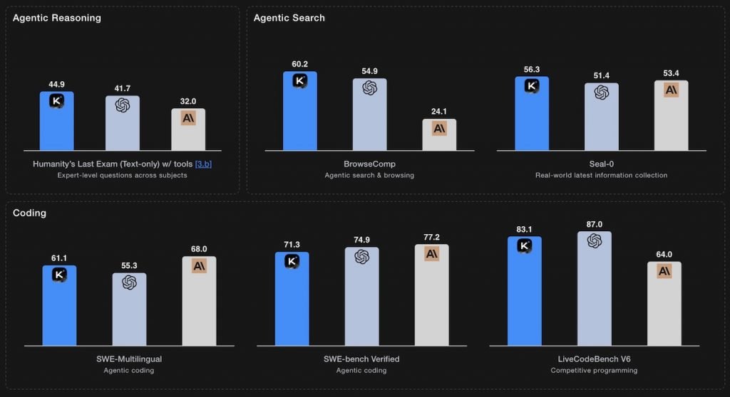 Kimi K2 Thinking حتی در بنچمارکهای ریاضی سطح بالا مانند AIME 2025 و HMMT 2025 نیز با GPT-5 برابری میکند. این اولینبار است که یک مدل متنباز بهطور کامل در کارهای استدلالی پیشرفته به سطح مدلهای اختصاصی پولی میرسد یا از آنها عبور میکند.