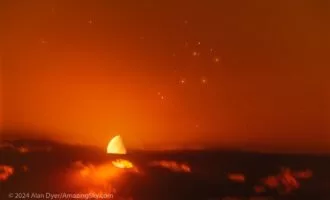همانطور که از آلبرتا، کانادا مشاهده میشود؛ ماه زمین، آسمان شرقی را با ستارگان هفت خواهر در خوشه پروین، تقسیم کرد.