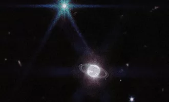 نپتون، غول یخی حلقهدار، در نزدیکی مرکز این تصویر نزدیک و در نور فروسرخ تلسکوپ فضایی جیمز وب شکار شد.
