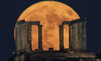 تصویر برجسته، ابرماه آبی را دقیقاً نزدیک به اوج اندازه خود، درحالیکه از معبد «پوزئیدون» در یونان بالا میرفت، ثبت کرد.