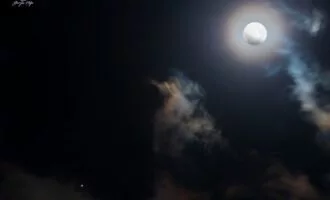 رنگینتاب، هالهی ماه و قمرهای گالیلهای مشتری زیبایی این تصویر را دو چندان کردهاند.