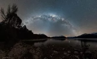 این تصویر پانورامای ۱۸۰ درجه از آسمان شب کهکشان راه شیری ما را به شکل قوسی بر فراز دریاچهای نشان میدهد.