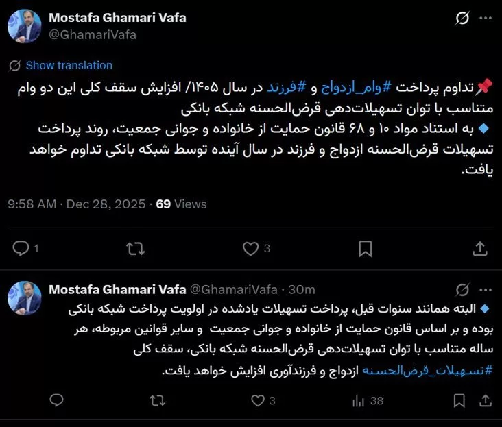روابط عمومی بانک مرکزی، مصطفی قمریوفا اعلام کرد: «به استناد مواد ۱۰ و ۶۸ قانون حمایت از خانواده و جوانی جمعیت، روند پرداخت تسهیلات قرضالحسنه ازدواج و فرزند در سال آینده توسط شبکه بانکی تداوم خواهد یافت.»