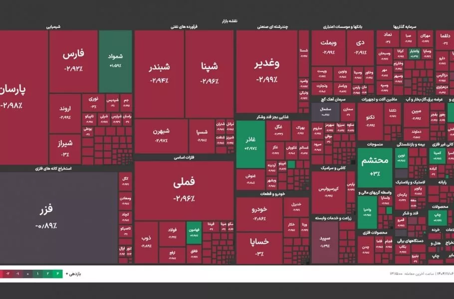 بهگزارش دیجیاتو، ۹۷ درصد از نمادهای بازار امروز منفی معامله شدند، بهطوریکه تنها ۲۴ نماد در محدوده مثبت معامله شدند و در مقابل ۶۴۰ نماد با کاهش قیمت مواجه شدند.
