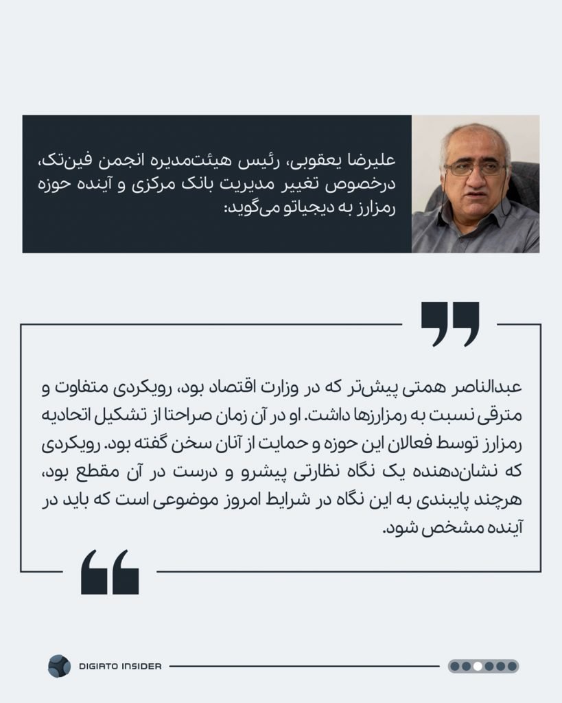 علیرضا یعقوبی، رئیس هیئتمدیره انجمن فینتک، درخصوص تغییر مدیریت بانک مرکزی و آینده حوزه رمزارز به دیجیاتو میگوید: