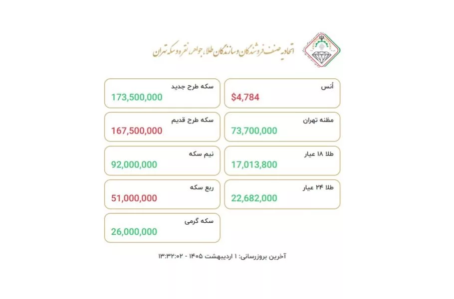 بنابراعلام اتحادیه طلا و جواهر استان تهران، سکه طرح جدید بدون تغییر نسبت به روز قبل ۱۷۳ میلیون و ۵۰۰ هزار تومان است. نیمسکه برچسب قیمتی ۹۲ میلیون تومانی دارد و ربعسکه هم ۵۱ میلیون تومان است.