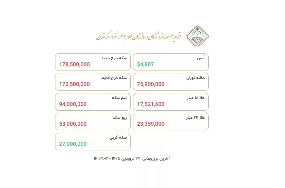 قیمت روز طلا و سکه [پنجشنبه ۲۷ فروردین ۱۴۰۵]