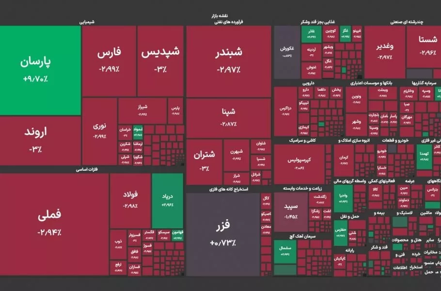 به گزارش دیجیاتو بخش عمده نمادهای بازار امروز هم منفی معامله شدند، بهطوریکه تنها ۴۵ نماد در محدوده مثبت معاملات بودند و در مقابل، ۶۹۱ نماد با کاهش قیمت مواجه شدند.