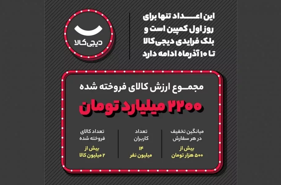 آمار منتشر شده از نخستین روز کمپین «بلک فرایدی» دیجیکالا نشان میدهد حجم معاملات در این پلتفرم آنلاین به سطحی بیسابقه رسیده است. بر اساس دادههای رسمی دیجیکالا، ارزش کالاهای فروختهشده این پلتفرم در ۲۴ ساعت نخست این کمپین به رقم ۲۲۰۰ میلیارد تومان یا ۲.۲ همت رسید.