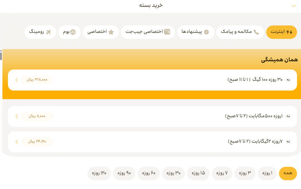 - در بخش دستهبندیها، بسته مورد نظر را انتخاب کنید.