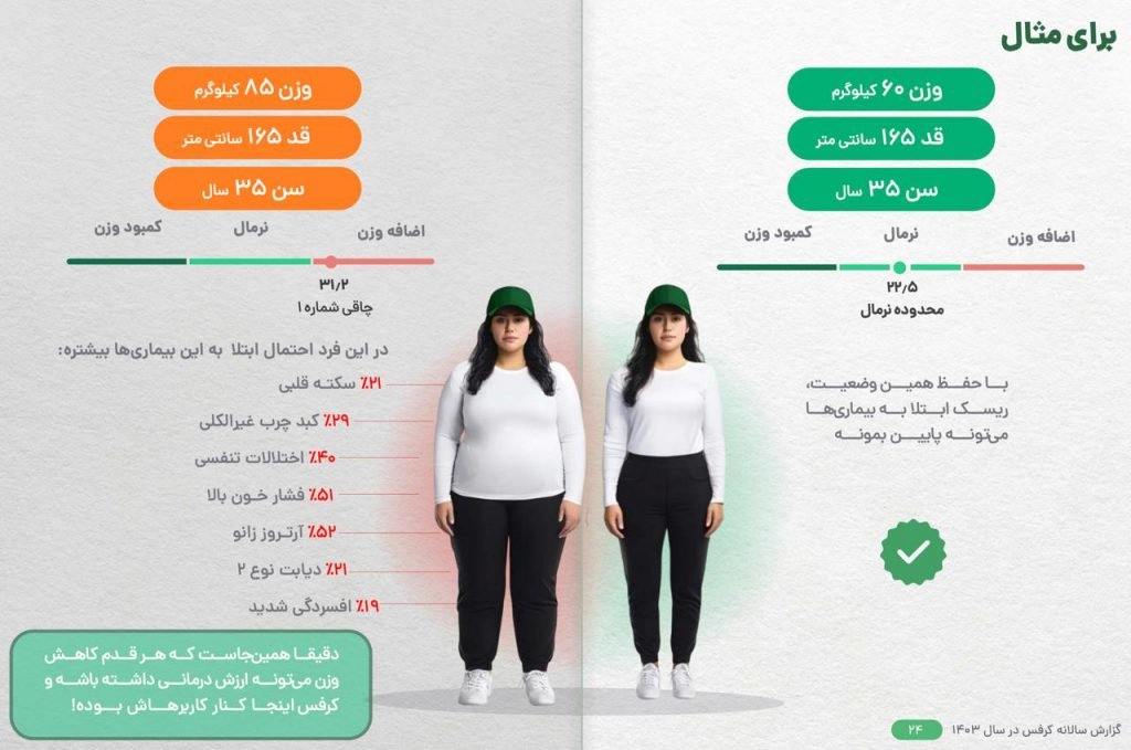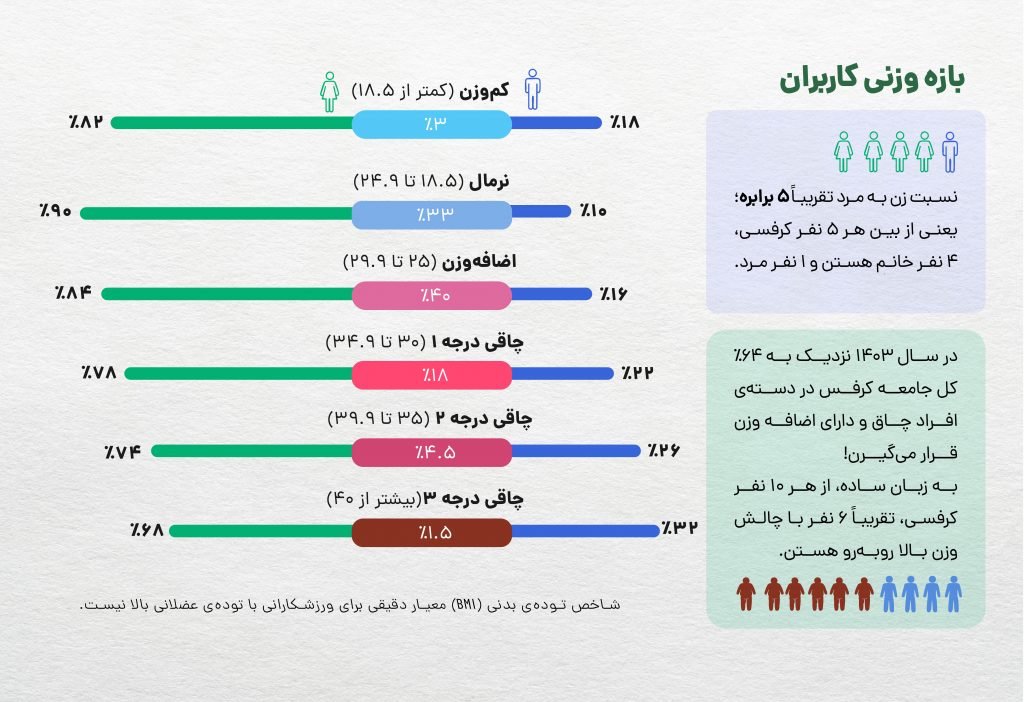 میتوان نتیجه گرفت در سال ۱۴۰۳ نزدیک به ۶۴ درصد جامعه کاربران کرفس در دسته چاقی و اضافه وزن قرار داشتهاند، یعنی از هر ۱۰ کاربر تقریبا ۶ نفر با مسئله چاقی یا اضافه وزن درگیر بوده است.