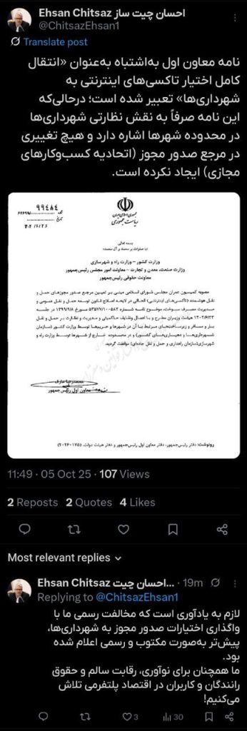 «نامه معاون اول بهاشتباه بهعنوان «انتقال کامل اختیار تاکسیهای اینترنتی به شهرداریها» تعبیر شده است؛ درحالیکه این نامه صرفاً به نقش نظارتی شهرداریها در محدوده شهرها اشاره دارد و هیچ تغییری در مرجع صدور مجوز (اتحادیه کسبوکارهای مجازی) ایجاد نکرده است.»