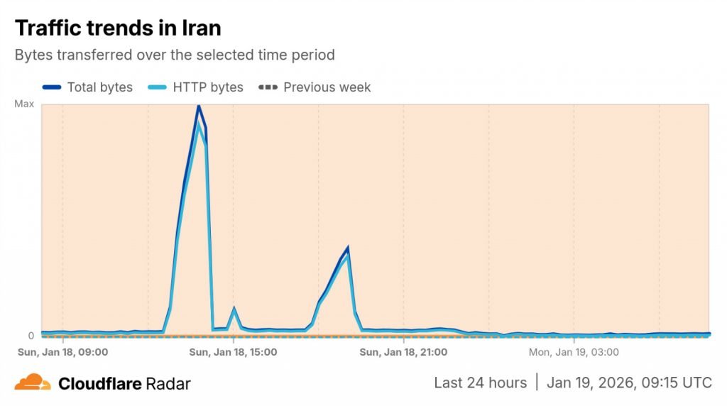 بر اساس دادههای شبکههای پایش اینترنت جهانی مربوط به امروز، رادار کلادفلر وضعیت اینترنت ایران را بهعنوان «قطع سراسری» درنظر گرفته است. این یعنی بسیاری از کسانی که روز گذشته توانسته بودند بهطریقی به اینترنت متصل شوند، امروز دسترسی خود را از دست دادهاند. نمودار ترافیک داده از مبدأ ایران هم نشان میدهد که پس از جهش نسبی دیروز، دوباره با خط نزدیک به صفر روبرو هستیم.