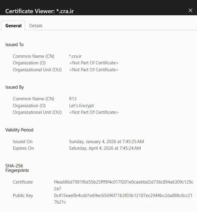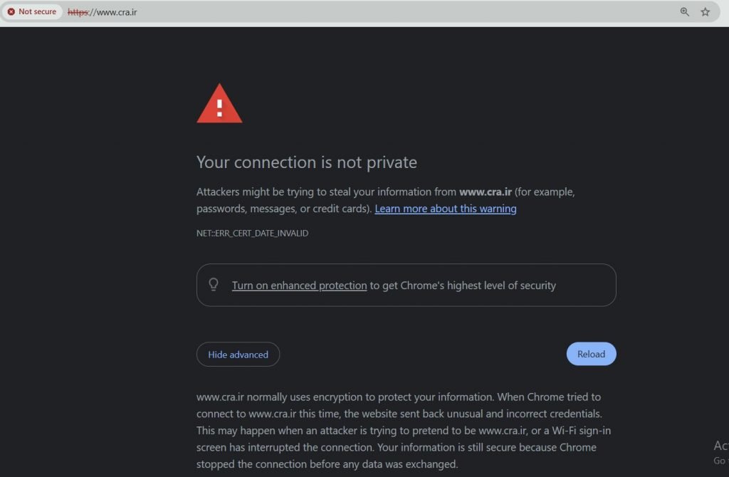 گواهی SSL سایت CRA.IR از ۱۵ فروردین ۱۴۰۵ تمدید نشده است
