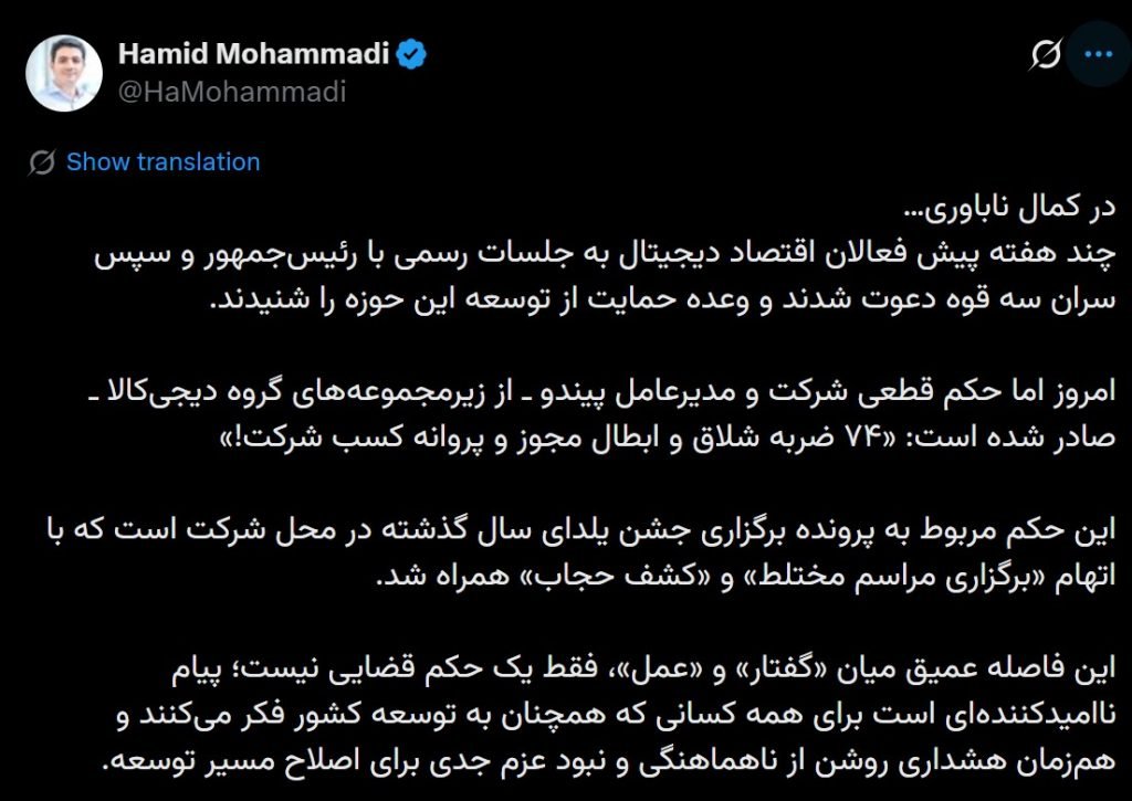 به گزارش دیجیاتو، «حمید محمدی»، همبنیانگذار «دیجیکالا» اعلام کرد، مدیرعامل پیندو، زیرمجموعه گروه دیجیکالا، به ۷۴ ضربه شلاق محکوم شده است. همچنین حکم لغو پروانه کسب پیندو نیز صادر شده است.