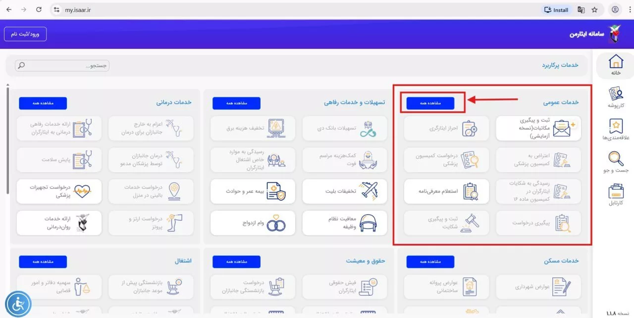 ابتدا وارد سامانه ایثار من شوید و از منوی اصلی گزینه «مشاهده همه» در بخش «خدمات عمومی» را کلیک کنید.