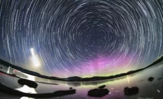 کمانهای دنبالهدار مسیر ستارگان، چرخش روزانه سیاره زمین را در این آسماننمای رنگارنگ شبانه منعکس میکنند.