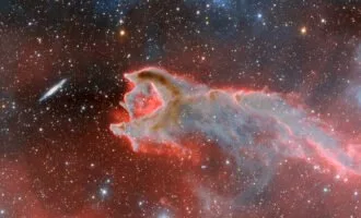 تصویر برجسته در قاب، به شکل V و رنگ نارنجی، سحابی مادون قرمز آفتابپرست است که توسط جریان مواد از یک ستاره کمجرم شکل گرفت.