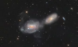 این قاب تلسکوپی در فاصله حدود 400000 سال نوری قرار دارد و شامل NGC 3165 کوچک و مایل به آبی در سمت راست است.