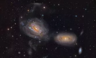 کهکشان NGC 3169 مانند توپ کاموایی درحال بازشدن و ادغام با کهکشان همسایهاش است.