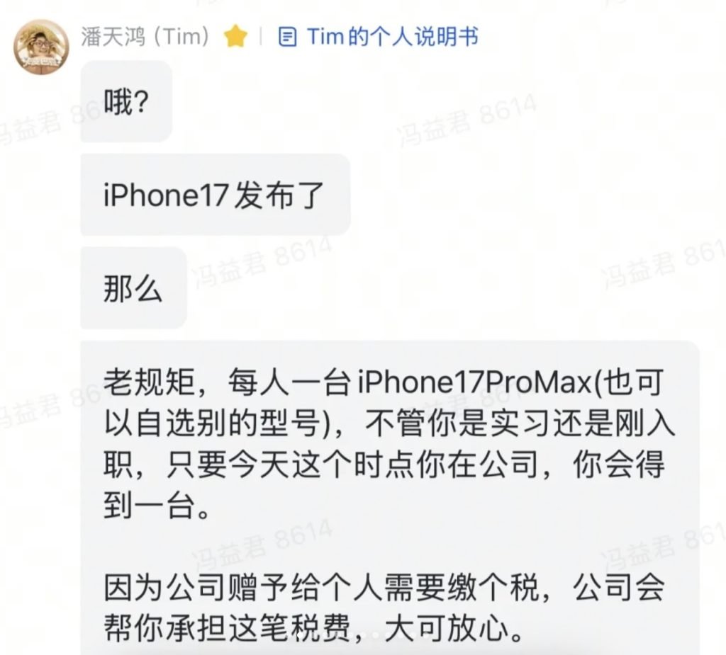 «خب آیفون ۱۷ معرفی شد. پس طبق روال همیشه، همه یک آیفون ۱۷ پرو مکس دریافت خواهند کرد (میتوانید مدل دیگری را هم انتخاب کنید). فرقی نمیکند کارآموز باشید یا به تازگی به شرکت پیوسته باشید، وقتی در شرکت حضور دارید، یکی دریافت خواهید کرد. از آنجایی که هدیهدادن آیفون توسط شرکت مشمول مالیات میشود، شرکت مالیات آن را نیز برای شما پرداخت خواهد کرد. پس خیالتان راحت باشد.»