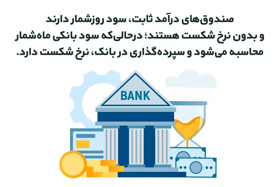 - نرخ شکست: برداشت زودتر از موعد در سپردههای بانکی معمولاً با نرخ شکست همراه است؛ صندوقهای درآمد ثابت نرخ شکست ندارند و سود بهصورت روزانه محاسبه میشود.