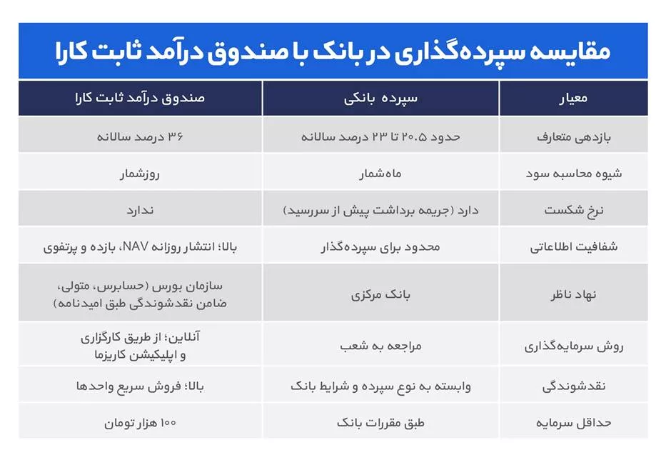 - شفافیت: ترکیب دارایی و بازده صندوقها روزانه منتشر میشود؛ در نظام بانکی چنین سطحی از گزارشدهی به سپردهگذار وجود ندارد.
