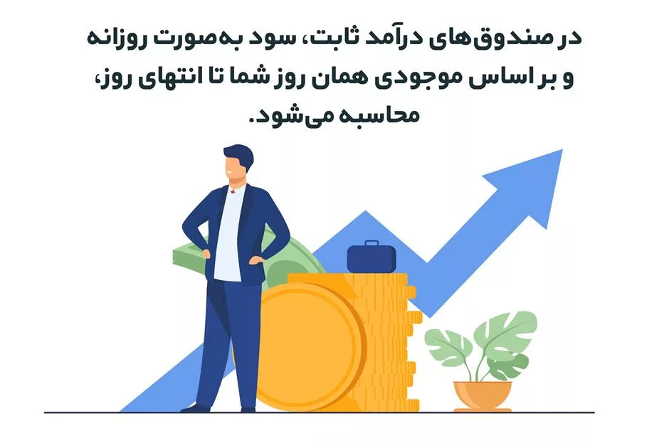 - صندوق درآمد ثابت: سود بهصورت روزشمار محاسبه میشود، بدون نرخ شکست. پرداخت میتواند ماهانه/فصلی باشد یا در صندوقهای «بدون تقسیم سود»، بهصورت رشد تدریجی ارزش واحدها باشد.