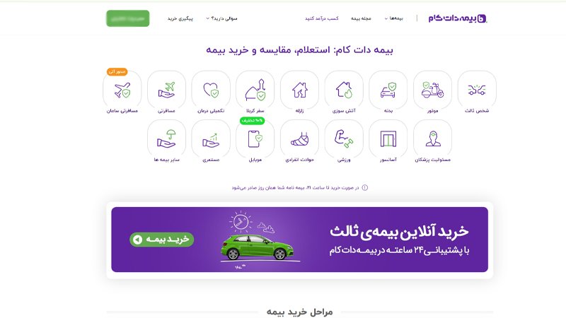 برای خرید انواع بیمه از بیمهداتکام کافی است به وبسایت بیمه دات کام مراجعه کنید. در ادامه مراحل خرید بیمه شخص ثالث به عنوان یکی از بیمههایی که در فصل زمستان بیشترین متقاضی را دارد، توضیح دادهایم: