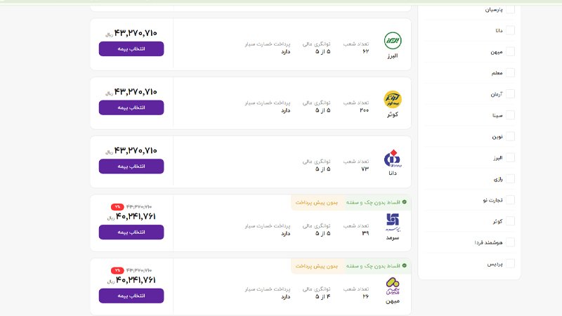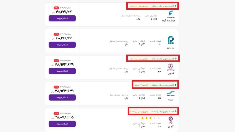 حتی در شرایط قطعی اینترنت بینالملل همچنان میتوان از امکان خرید قسطی و بدون پیشپرداخت بیمهداتکام استفاده کرد. در فرایند خرید، هنگام مقایسه بیمهها برچسب «اقساط بدون چک و سفته» و «بدون پیش پرداخت» بالای لوگوی شرکتهای بیمه (مطابق شکل زیر) نمایش داده میشود. شما میتوانید با انتخاب این بیمهها بدون ارائه چک، سفته و هیچگونه سودی، صرفا با اعتبارسنجی بانکی بیمه موردنظر خود را خریداری کنید.