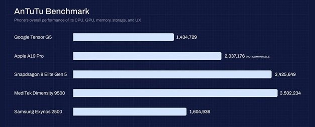 - Dimensity 9500: با کسب بیش از ۳.۵ میلیون امتیاز، صدرنشین شد.