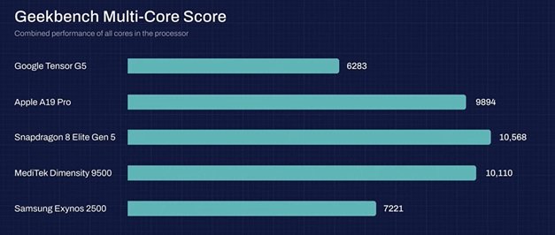در مجموع نتایج بهدست آمده، A19 Pro اپل با اختلاف بسیار ناچیز، عنوان سریعترین پردازنده موبایل ۲۰۲۵ را از آن خود کرد. A19 Pro قدرت پردازش خام عالی تکهستهای و بهترین عملکرد گرافیکی را به نمایش گذاشت و در ضمن خنکترین دستگاه در طول تست بود. این نشان میدهد قیمت ایفون ۱۷ نسبت به عملکردی که ارائه میدهد مناسب است.