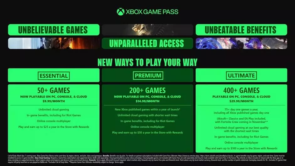 - Game Pass Essential: سرویسی که پایهترین سطح Game Pass را تشکیل میدهد و شامل دسترسی به کتابخانهای از بازیهای کنسول به همراه قابلیت بازی آنلاین است. قیمت رسمی در آمریکا: 9.99 دلار در ماه.