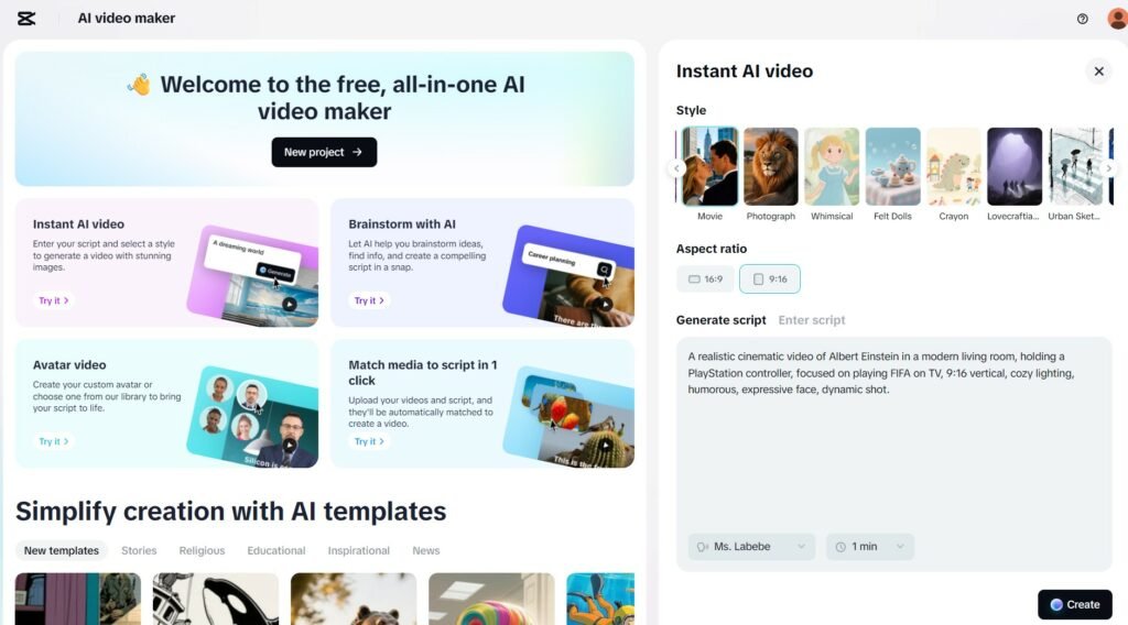 بعد از ثبت نام، روی گزینه Free AI Video Maker کلیک کنید تا وارد قسمت ساخت ویدیو با هوش مصنوعی شوید.