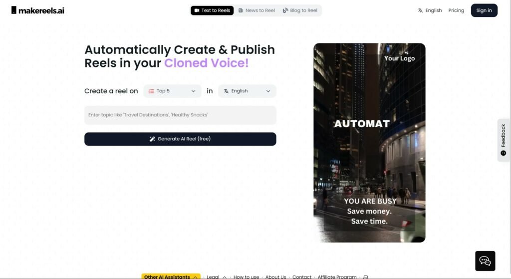 یک ابزار ساده و سریع برای تولید ریلزهای آماده با قالبهای متنوع است که مخصوص کاربران تازهکار طراحی شده. برای استفاده از این ابزار کافیست وارد سایت Make Reels شوید و ایده ویدیو کوتاه خود را وارد کنید. این ابزار قابلیتهای متنوعی مثل تبدیل یک خبر یا نوشتههای وبلاگ شخصی خودتان به ویدیوهای کوتاه را دارد.