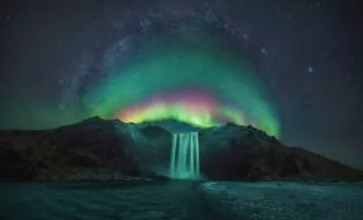تصویر روز ناسا: شفق قطبی رنگین کمانی بر فراز آبشار ایسلند